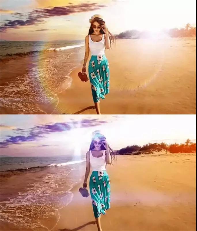 比如說(shuō),攝影師直接將太陽(yáng)放入畫面中,那么就會(huì)看到人像頭部的眩光;如果不將太陽(yáng)放入畫面中,就會(huì)看到周邊暖黃色的光暈;還有就是人像身上會(huì)有類似彩虹色的圓形光斑。