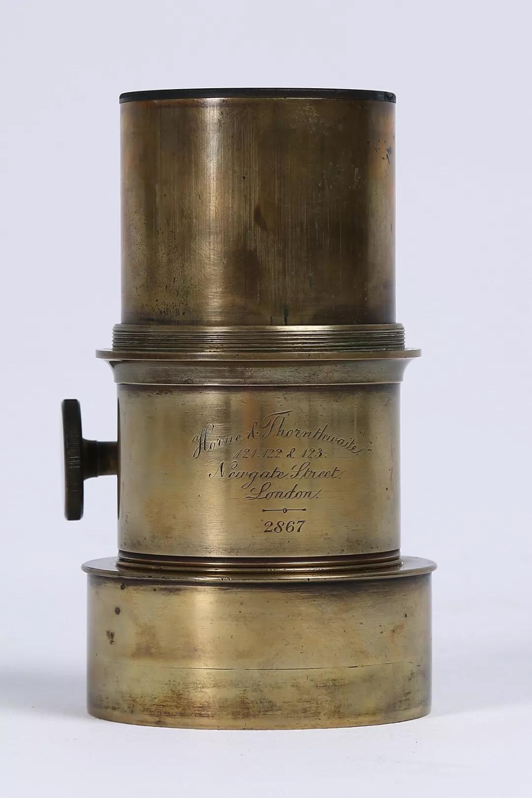 相機片夾(匣)缺失。鏡頭為匹茲伐(Petzval)250mm F4.5 人像鏡頭(圖 06),鏡頭編號:2867,由英國霍恩公司于 1841 年至 1842 年制造。這只鏡頭由黃銅制成,又大又重,側(cè)面有個旋鈕用來調(diào)焦(圖 07)。