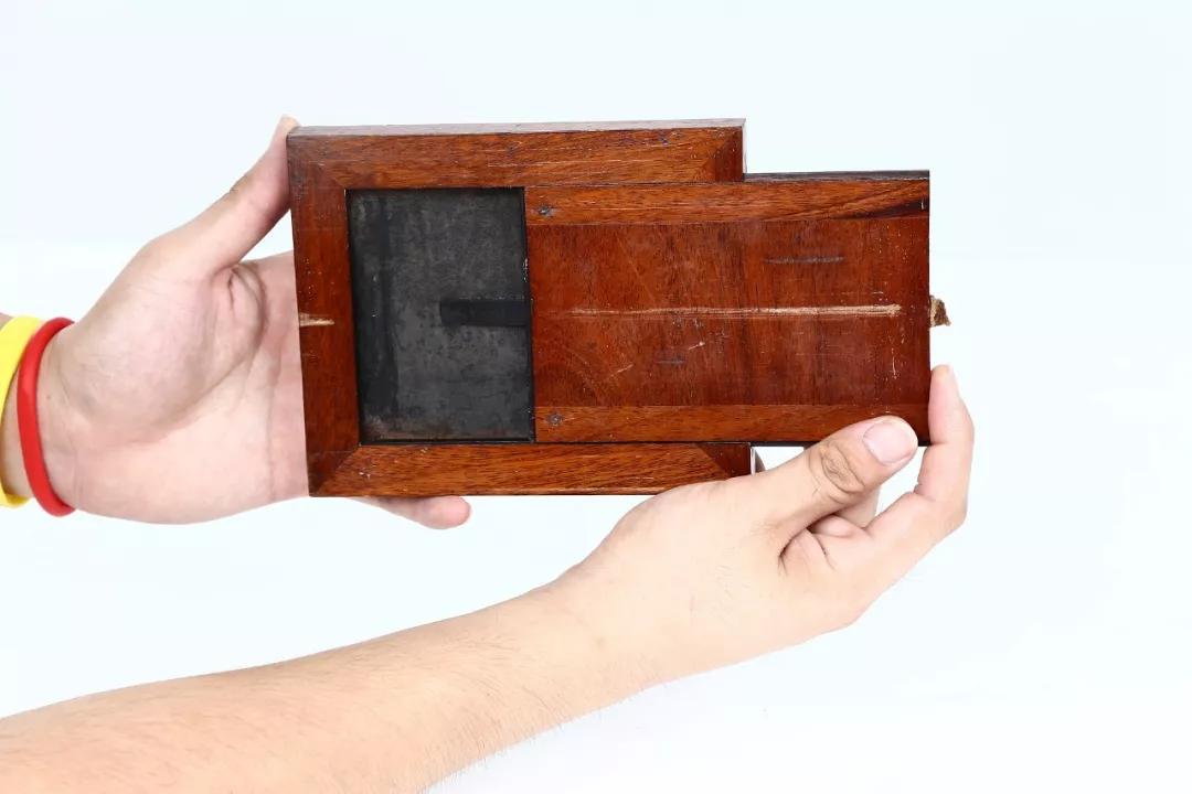 本人有幸收藏了這樣一臺尾板式滑箱照相機(圖02)。這臺相機是 1841-1842 年間在法國生產(chǎn)的,機身由胡桃木制成,尾板式滑箱結(jié)構(圖03),金屬配件均為黃銅制。