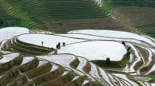 隨著朝陽逐漸爬上藍(lán)天,梯田中濃濃的水汽也慢慢化開,像是一滴白滴入了金的底色,在這精致的春景中一點(diǎn)點(diǎn)地蔓延開來,飄飄欲仙,美如仙境;