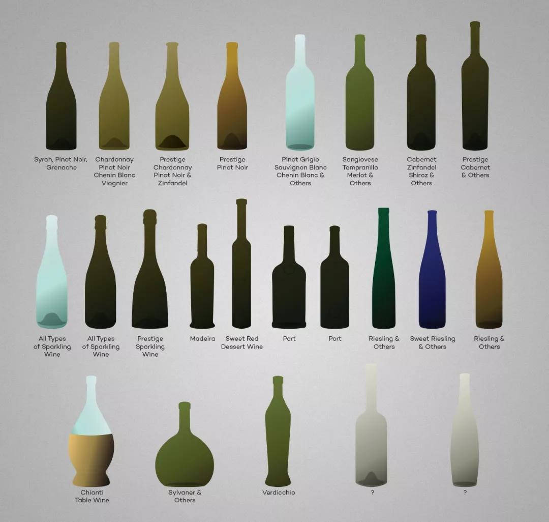 在這個統(tǒng)一的設計理念下,不同產區(qū)的不同瓶形,有一些是實用的區(qū)別——比如香檳格外厚重堅固的瓶子是因為瓶里壓力高達6個大氣壓。大部分其實都是因為傳統(tǒng)——當初設計瓶子時就是這個形狀,沒有什么理由。后來也再沒改過。