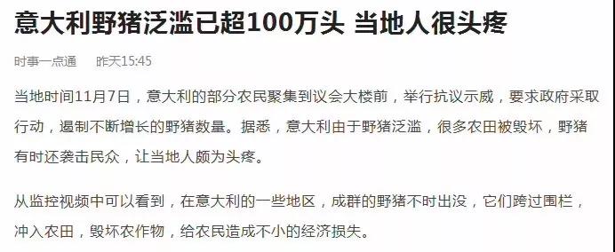 意大利的農(nóng)民聚集到議會(huì)門前,要求政府采取措施,遏制已泛濫超百萬(wàn)頭的野豬群。當(dāng)?shù)匾柏i十分霸道:它們毀壞農(nóng)田,襲擊民眾,連種族的天敵——狼都不敢輕易接近,每年給意大利農(nóng)民造成的直接經(jīng)濟(jì)損失超過(guò)1億歐元。