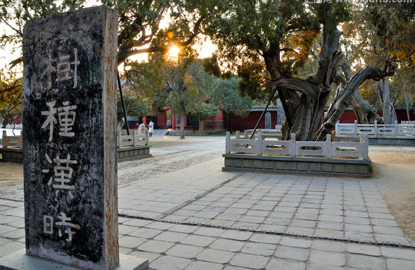 時光飛逝,轉眼到了民國年間,軍閥孫良誠的部隊也駐扎在岱廟里,其中一個小士兵聽說了這個故事后,也要在旁邊的連理柏上試上一試,結果還沒來得及行動呢,風聲傳出去被當時的道長尚士廉攔住,報告給了他的長官。偏巧這位長官是一位敬神之人,命人把小士兵拖來用皮鞭抽了一頓(屬下冒犯神靈這還了得,闖禍的小士兵自然是逃躲不了皮肉之苦),小士兵懷恨在心,等到晚上月黑風高無人之際,他把他的棉被沾滿煤油塞到連理柏中的一株,一把火燒毀了其中一株,當年乾隆皇帝來到泰山時看到這株柏樹雙干而立,古柏參天,被它不屈的精神折服深深的印在腦海里,乾隆皇帝回到皇宮后憑借印象把它描繪了出來,乾隆皇帝先后來泰山總共留下146首詩唯獨留下這一副畫,我們現(xiàn)在看到正中的這個《御制漢柏圖贊》碑就是當年乾隆皇帝憑借記憶畫下的畫,不幸果然被乾隆爺言中,現(xiàn)在的連理柏已經(jīng)是一生一死,生離死別,漢柏無言,但我們相信他們會把生死相隨的承諾一直堅守到永遠。