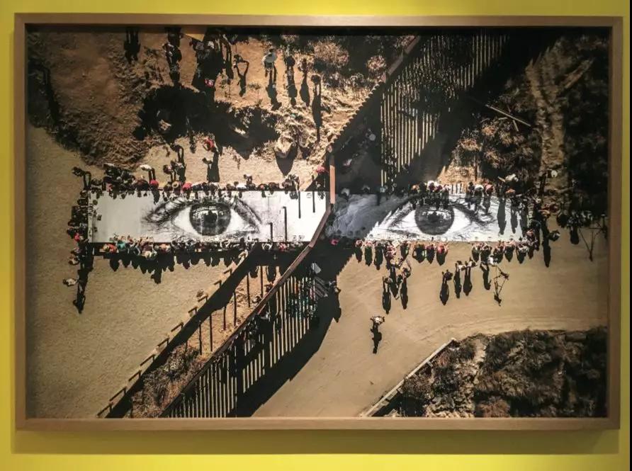 這種平靜馬上被接下來(lái)的作品打破。法國(guó)藝術(shù)家JR在 2017 年拍攝于美國(guó)與墨西哥邊境的作品《移民,梅拉,穿越邊境的野餐》(Migrants, Mayra, Picnic Across the Border)直接以一雙眼睛和觀眾對(duì)視。照片從空中俯拍,應(yīng)該由無(wú)人機(jī)完成,細(xì)看之下,這雙眼睛印在一張有兩種形態(tài)的餐桌上,一種是堅(jiān)硬的桌子,另一種是柔軟的桌布。桌子和桌布并未真正相接,但因?yàn)橐曈X(jué)和情感上的慣性,把它們看作是一張穿越了邊境的餐桌。與這張餐桌對(duì)視,有那么一刻,可以忽視墻的阻隔,只看見(jiàn)這些同吃同喝的人們。