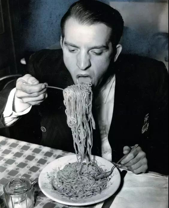 比如,維吉(Weegee)拍攝的《菲利普·斯塔佐在 WPA 上享受他最喜歡的食物,因?yàn)樗?tīng)說(shuō)軍隊(duì)不太喜歡供應(yīng)意大利面》(Phillip J. Stazzone is on WPA and enjoys his favourite food as he'sheard that the Army doesn't go in very strong for serving spaghetti. 1940)以他慣常的戲劇化表達(dá)讓一副普通境界的吃相躍然紙上。維吉鏡頭下的美國(guó)在 1940年尚有一盤(pán)意大利面,拉塞爾·李(Russell Lee)在同一年份走入美國(guó)新墨西哥州的鄉(xiāng)下,便還能看見(jiàn)大蕭條最后的尾聲:小城市普通美國(guó)家庭并不豐盛的晚餐。20年后,同樣在美國(guó),食物上的局促有了很大改觀,但更直觀的窘境達(dá)到了高峰: 種族問(wèn)題。佚名攝影師拍下的《午餐吧臺(tái)的罷工》(Lunch Counter Sit-in) 即顯示了這個(gè)問(wèn)題。兩名美國(guó)黑人大學(xué)生在“只準(zhǔn)白人” (whites-only)的餐廳吧臺(tái)上學(xué)習(xí),兩名白人女服務(wù)員在觀望他們的同時(shí)拒絕為他們服務(wù)。冰冷拒絕且?guī)?,是非常純粹的仇恨表情。四個(gè)人,圍桌,卻沒(méi)有可供享用的食物。種族主義作為曾經(jīng)橫亙?cè)谒麄冎g無(wú)形的高墻,直到今天都還有殘?jiān)珨啾诹舸妫癁榈桶慕O腳石。