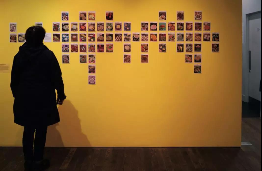 《減肥者食譜卡片》(Weight Watchers Recipe Cards, 1974)幾乎鋪滿了一整面墻。這面墻也最受觀眾歡迎,明黃底色之下,滿墻各式各樣的食物,引發(fā)熱烈討論,時(shí)而歡聲笑語(yǔ),熱鬧若市,引得剛?cè)雸?chǎng)的觀眾側(cè)目。粗看之下,這就是一墻食物,細(xì)細(xì)看來(lái)往往都要吸幾口涼氣:這些食物在外形上都有超越常規(guī)審美的模樣,大多濃厚濁膩,用“黑暗料理”形容不為過(guò),有的甚至算得上“邪典料理”……目的何在?——《減肥者食譜卡片》。理論上,減肥需要控制飲食并加強(qiáng)鍛煉,控制飲食的方法不少,遏制食欲無(wú)疑能從源頭上解決問(wèn)題。于是,這些有助于遏制食欲的小卡片應(yīng)運(yùn)而生,可謂“一本正經(jīng)胡說(shuō)八道”,難怪觀眾會(huì)邊看邊笑。