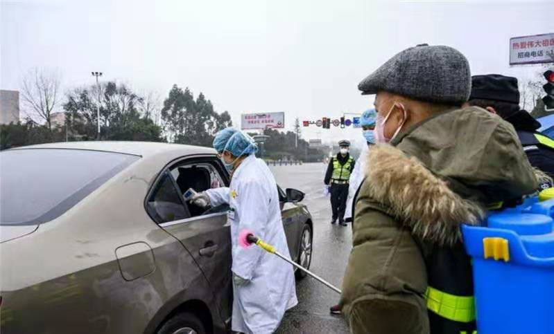 1月28日,四川省成都市龍泉驛區(qū),為了嚴(yán)防成都的過界入城車輛的疫情,龍泉驛區(qū)大面鎮(zhèn)醫(yī)院、錦江區(qū)醫(yī)院聯(lián)合公安、防疫、執(zhí)法等部門冒雨嚴(yán)防死守,檢查出入車輛及司乘人員,并對(duì)進(jìn)城車輛消毒,對(duì)人員檢測(cè)登記體溫。