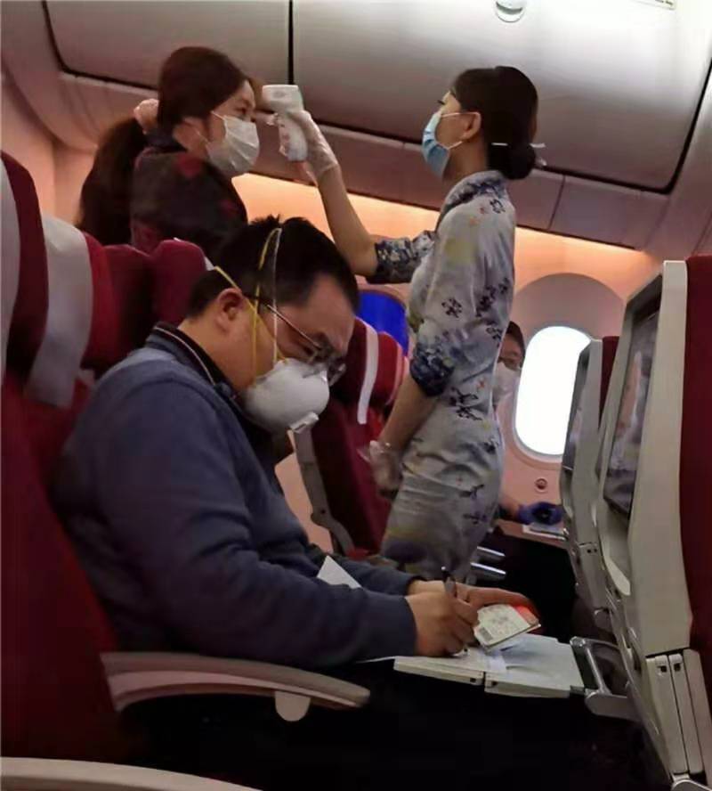 2月1日,在海南航空公司的國際航班上,機(jī)組人員向旅客發(fā)放健康申報(bào)表,并進(jìn)行必要的健康檢測(cè)和消毒。中國民航嚴(yán)格有序的措施,確保國際間人員往來和目的地國家的健康安全。