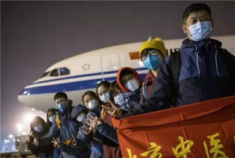 1月27日18時(shí)許,首都國際機(jī)場(chǎng),北京市屬醫(yī)院援武漢醫(yī)療隊(duì)隊(duì)員合影。當(dāng)日,這支醫(yī)療隊(duì)乘坐國航包機(jī)奔赴武漢,隊(duì)員136人全部來自北京市各三甲醫(yī)院。隨同醫(yī)療團(tuán)隊(duì)一起登機(jī)的,還有武漢急需的醫(yī)療用品。