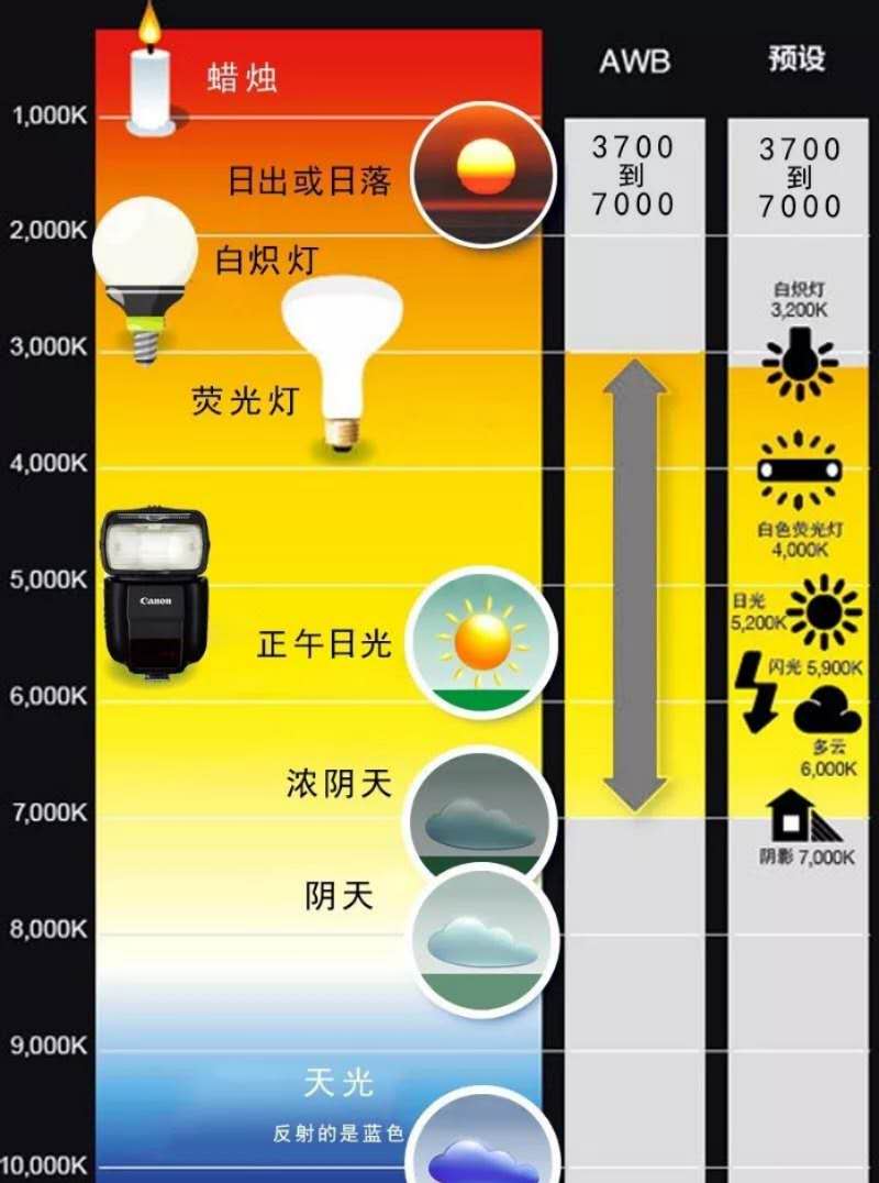 說到色溫一定要說說什么是白平衡,白平衡的概念涉及到色彩學的知識,作為初學者也不需要了解過深。只要明白白平衡是為了還原“白就是白”,也就是說使您的照片更趨于人的視覺習慣。比如,我們在白熾燈燈光的房間內(nèi)拍攝人物,如果白平衡調整不好,就容易偏色,出現(xiàn)紅臉,設置適當?shù)陌灼胶庾屓四樋瓷先シ弦曈X習慣,這就是使用白平衡的體現(xiàn)。白平衡調整可以手動也可以自動(AWB),也可以通過后期Camera raw工具調整白平衡,也可以利用色溫進行藝術創(chuàng)作。