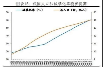 2019年城鎮(zhèn)化率達(dá)60.60%,比上年末提高1.02個(gè)百分點(diǎn),保持穩(wěn)步增長(zhǎng)態(tài)勢(shì),較高收入經(jīng)濟(jì)體的81.3%仍有20個(gè)百分點(diǎn)的空間。過去四十年,中國城鎮(zhèn)常住人口從1.7億快速增至8.5億,凈增加6.8億,城鎮(zhèn)化率從17.9%提升至60.6%,提高43個(gè)百分點(diǎn),深刻地改變了中國經(jīng)濟(jì)社會(huì)格局,成就了過去中國重化工業(yè)、大規(guī)?;A(chǔ)設(shè)施投資、房地產(chǎn)、消費(fèi)升級(jí)等的飛速發(fā)展。