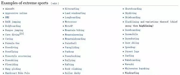 26. 登山運動(Mountaineering):是以攀登至頂峰為目標的運動,廣義的登山運動不限制所登山岳的高度、攀登的方式、使用的器材等等,而狹義的登山運動則指利用專門的裝備和技術攀登一定海拔范圍的山峰。不過作為極限運動只能按照狹義來解釋吧。