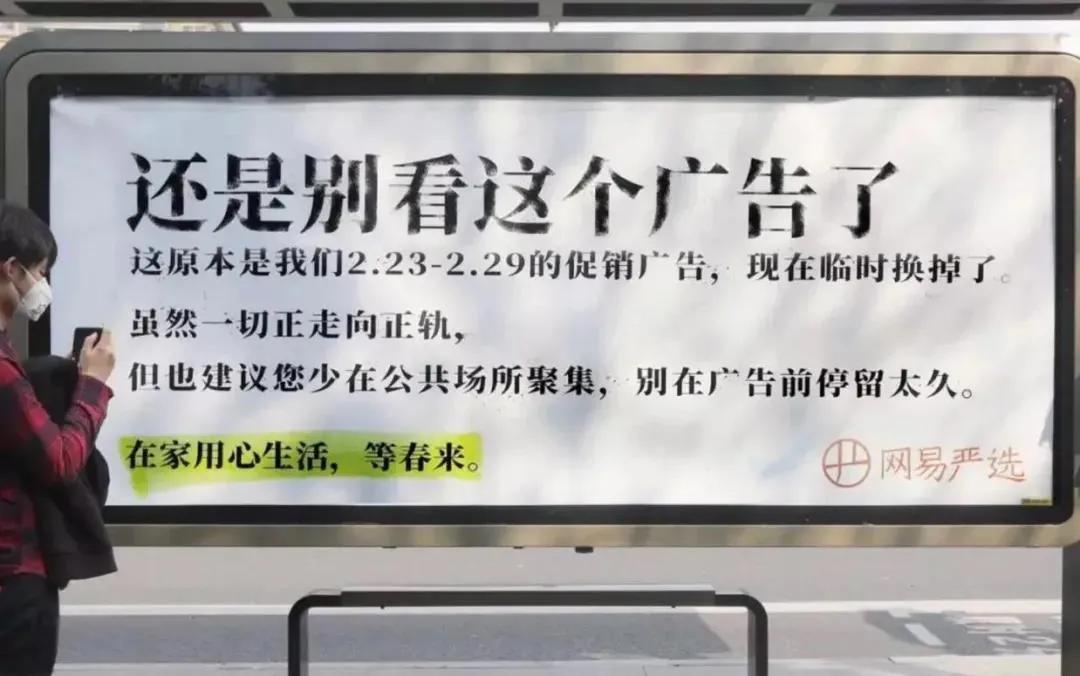 近日,在某中心商場附近的網(wǎng)易嚴(yán)選特殊戶外廣告“還是別看這個(gè)廣告了”刷屏。廣告牌上寫著:“還是別看這個(gè)廣告了,這原本是我們2.23-2.29的促銷廣告,現(xiàn)在臨時(shí)換掉了。雖然一切正走向正軌,但也建議您少在公共場合聚集,別在廣告前停留太久。在家用心生活,等春來?!本W(wǎng)易嚴(yán)選將廣告作為溫馨提醒,勸用戶不要看,不要聚眾,既展現(xiàn)了創(chuàng)意又傳遞了溫度。