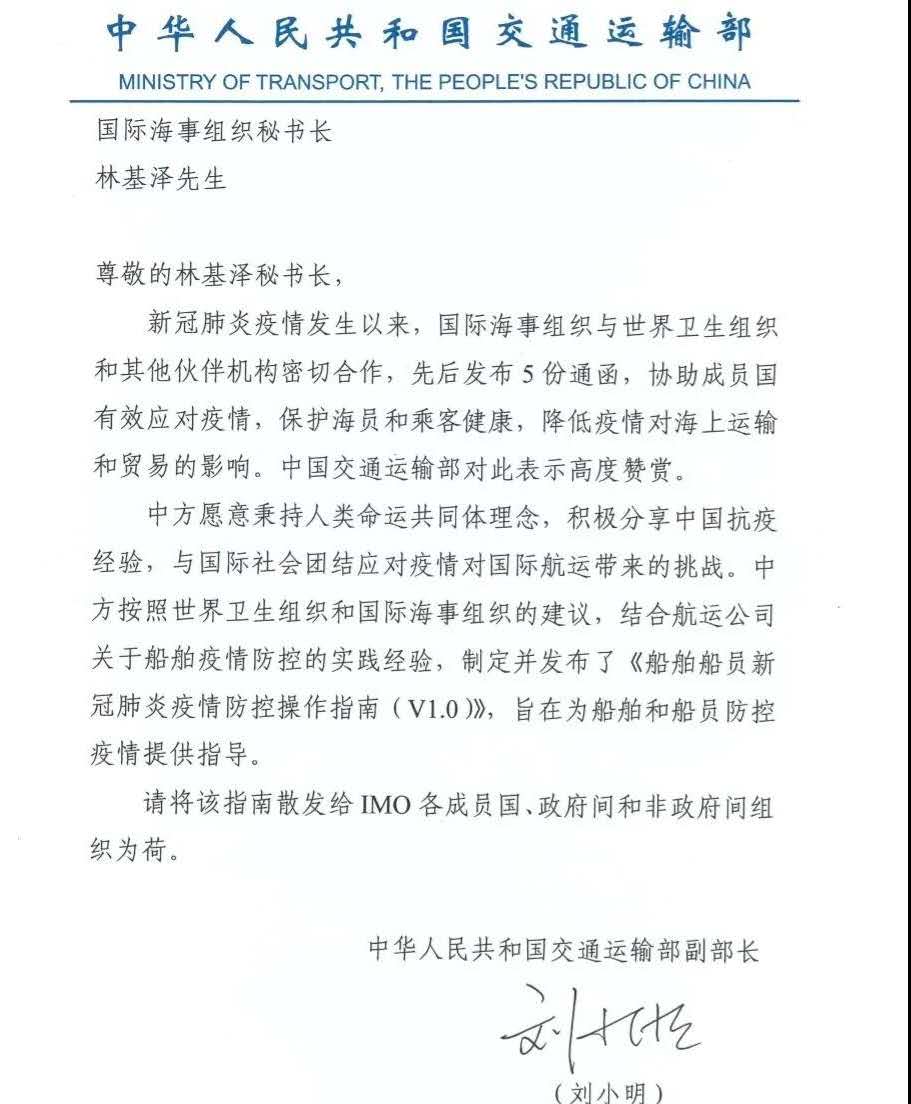 2020年3月18日,國際海事組織IMO發(fā)布Circular Letter No.4221,該通函件轉(zhuǎn)發(fā)了IMO秘書長林基澤先生收到的中華人民共和國交通運(yùn)輸部劉小明副部長3月11日發(fā)送的信函,信函后附《船舶船員新冠肺炎疫情防控操作指南(V1.0)》。IMO正式向174個成員國推薦由中國海事局編制的《船舶船員新冠肺炎疫情防控操作指南》,《指南》結(jié)合廣東海事局和航運(yùn)公司關(guān)于船舶疫情防控的實(shí)踐經(jīng)驗(yàn)制定,包括了船舶落實(shí)防控實(shí)施,加強(qiáng)船員個人防護(hù)等6個方面。