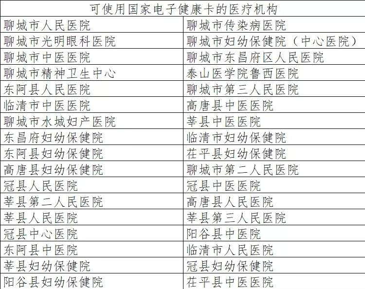 目前聊城市可以正常使用國家電子健康卡的醫(yī)療機構如下表: