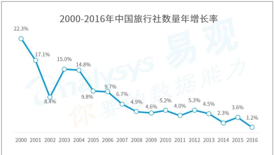 根據(jù)中國旅行社協(xié)會《2018年中國旅行社行業(yè)發(fā)展年度報告》數(shù)據(jù)顯示,2016年中國旅行社數(shù)量年增長率僅為1.2%,線下旅行社增速持續(xù)放緩。國內(nèi)旅行社目前發(fā)展定位不明確,產(chǎn)品同質(zhì)化現(xiàn)象嚴重。
