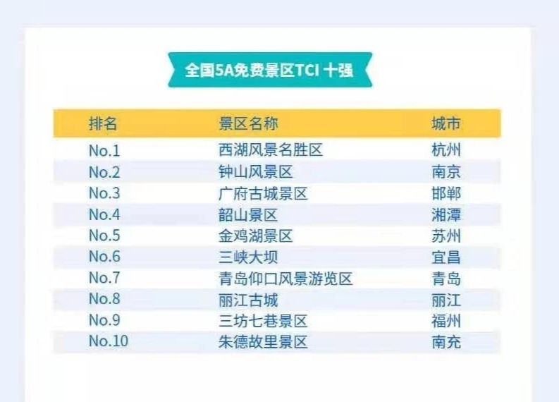 報(bào)告還顯示,頤和園、天壇公園、廣州長隆旅游度假區(qū)、黃鶴樓、秦始皇兵馬俑博物館、故宮博物院、蕪湖方特旅游度假區(qū)、瘦西湖、大唐芙蓉園、華山風(fēng)景名勝區(qū)等亦位居全國5A收費(fèi)景區(qū)TCI榜單的前列;西湖風(fēng)景名勝區(qū)、中山陵景區(qū)、鐘山風(fēng)景區(qū)、廣府古城景區(qū)、韶山景區(qū)等位居全國5A免費(fèi)景區(qū)TCI的前列。
