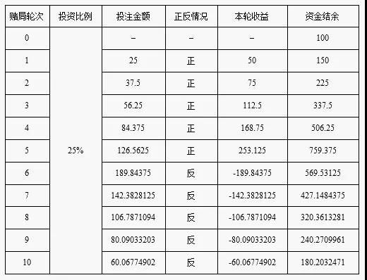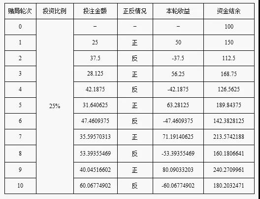 計算后每次下注比例為當時總資金的25%,這樣就能獲得最大收益。