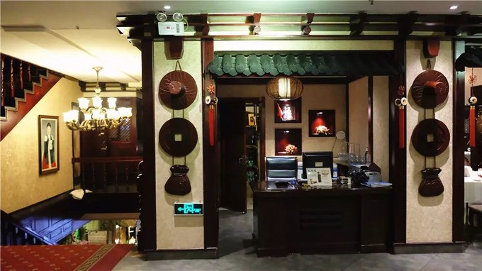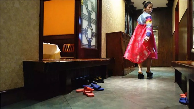這個(gè)飯店里的陳設(shè)和布局,都是有著鮮明的朝鮮特色的,墻紙、掛飾、裝修調(diào)調(diào)暖色而濃重。