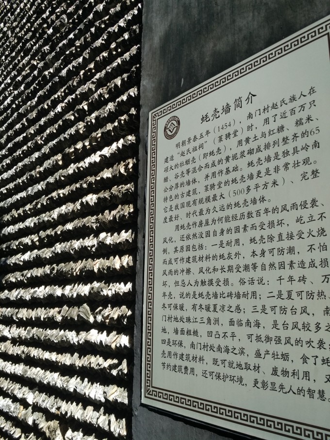 下面就是重頭戲:菉猗堂的蠔殼山墻,包攬我國最大、最古老、保存最好的蠔殼墻。蠔殼防潮通風(fēng)防臺風(fēng),屹立五百年而不倒,也是廢物利用的典范。