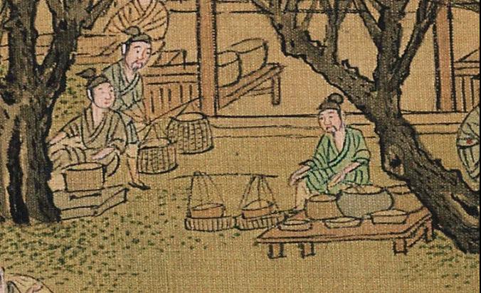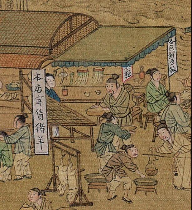 賣生魚的魚行也流動(dòng)經(jīng)營(yíng),“賣生魚則用淺抱桶,以柳葉間串清水中浸,或循街出賣,毎日早惟新鄭門、西水門、萬勝門,如此生魚有數(shù)千檐入門。冬月即黃河諸遠(yuǎn)處客魚來,謂之‘車魚’,毎斤不上一百文?!眱r(jià)廉物美的流動(dòng)魚販極大的便利了人民生活。《水滸傳》里,楊志賣刀,武大郎賣炊餅,都情同流動(dòng)攤販,也不交稅。