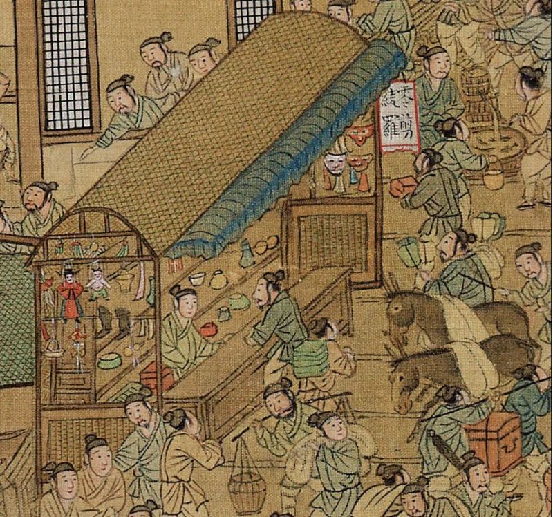 街道不僅空地上有攤販、街頭藝人表演、說書活動(dòng),連東京大相國(guó)寺內(nèi)也是萬姓交易,“近佛殿,孟家道院王道人蜜煎”,“兩廊皆諸寺師姑賣繡作、領(lǐng)抹、花朵……之類”,飛禽貓犬,珍奇玩好,無所不有。罷退下來的官員也擺地?cái)傎u帶不走的東西。甚至大內(nèi)也可以擺攤:“諸司人自賣飲食珍奇之物,市井之間未有也?!币虼髢?nèi)的特殊性,原本普通的商品也身價(jià)倍增,“凡飲食時(shí)新花果、魚蝦鱉蟹、鶉兔脯臘,金玉珍玩衣著,無非天下之奇……”