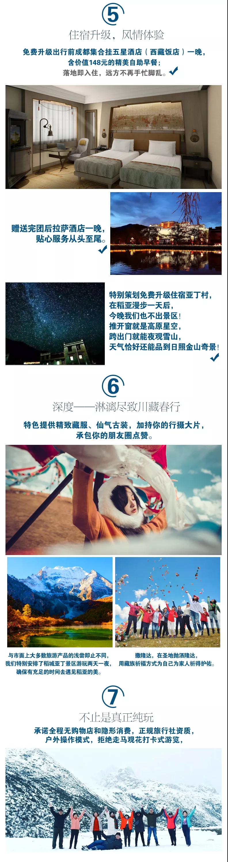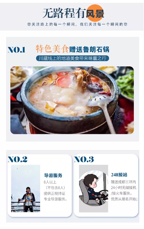 6、贈送:贈送魯朗石鍋雞,地道川藏美食(另外點菜需游客自行支付);贈送戶外禮包旅游三寶、魔術(shù)頭巾、礦泉水;贈送提供精致藏服、仙氣古裝,加持你的行攝大片;贈送成都24小時專車接機接站服務(wù),給你最貼心的旅程。(贈送項目不用費用不退)