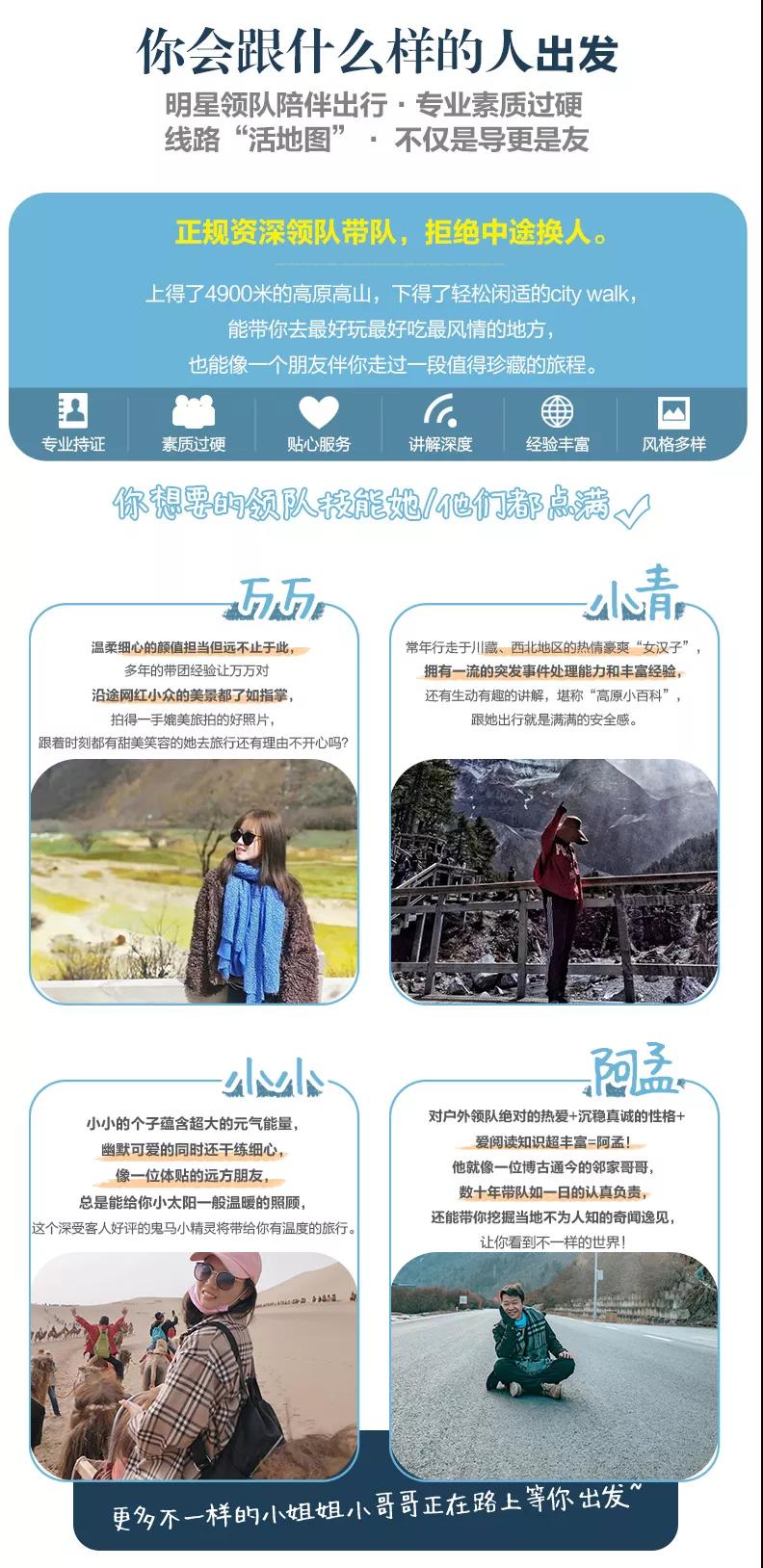 5、導(dǎo)游服務(wù):8人以上(不含8人)提供正規(guī)持證導(dǎo)游;8人及以下,由經(jīng)驗豐富的司機提供向?qū)Х?wù),無單獨導(dǎo)游服務(wù),請諒解。