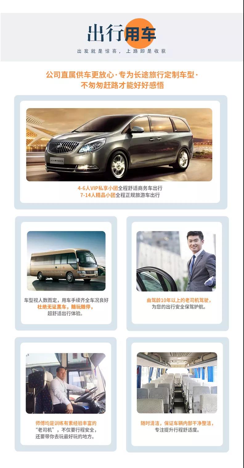 2、交通:4-6人VIP私享小團全程舒適商務(wù)車出行,7-14人精品小團全程正規(guī)旅游車出行;保證一人一正座位,車型大小根據(jù)實際人數(shù)安排,且由駕駛經(jīng)驗豐富的司機為您的出行保駕護航,報價包含車費、油費、停車費、維修費及司機勞務(wù)費。