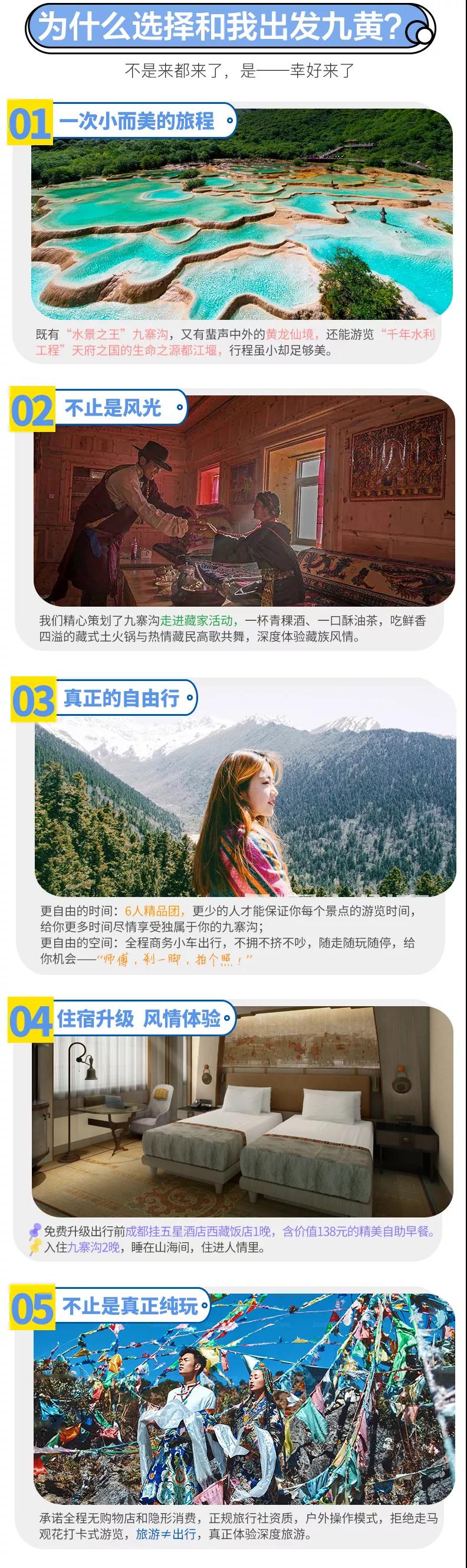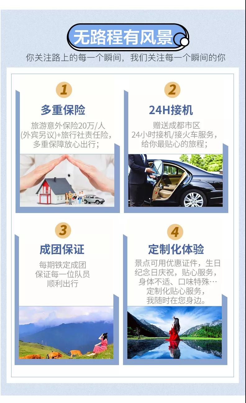 3、九寨溝面積較大游客需求不一,因此主要以游客自助游形式游覽,如無導游陪同望您諒解。游覽開始前導游會與您約定好集合時間,請務(wù)必按時到達指定地點,避免耽誤大家接下來的行程;