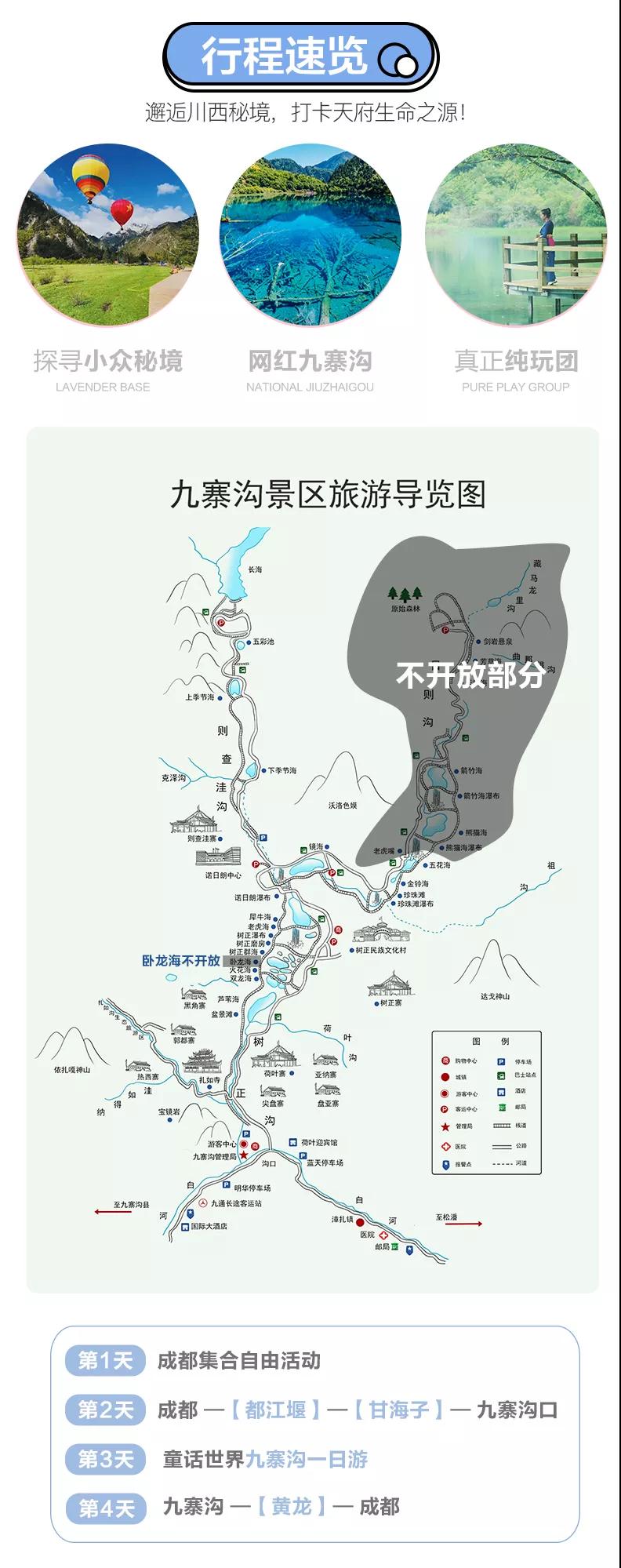 4、九寨溝景區(qū)實行分區(qū)域開放,開放區(qū)域為溝口經(jīng)諾日朗瀑布至長海,扎如溝的扎如寺及日則溝的鏡海;其中,長海、五彩池、鏡海、諾日朗瀑布、樹正群海、雙龍海瀑布、扎如寺等景觀原則上為步行游覽區(qū),具體游覽方式請聽從隨車講解員安排。