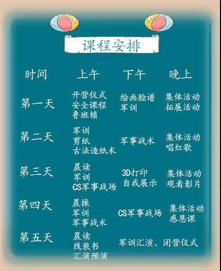 做一個屬于自己的臉譜·開啟自己的競賽模式體驗非遺文化剪紙藝術·享造紙之樂·觀看愛國主義電影·3D打印屬于你的傳奇·徒步探索自然·誦讀經(jīng)典·才藝表演·紙·cs真人挑戰(zhàn)·軍事對抗賽·感恩課·國學文化線裝書·草坪運動會·茶話會·軍事匯演及文藝展示·結營儀式·結業(yè)證書。