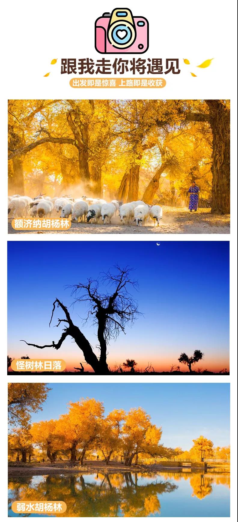 隨后我們在【額濟納胡楊林景區(qū)】中自行游玩攝影創(chuàng)作,胡楊有“生而一千年不死,死而一千年不倒,倒而一千年不朽”的說法,被世人稱為英雄樹。千姿百態(tài)的胡楊遍布在沙漠中,漫步輝煌的金秋胡楊林,用鏡頭記錄這中國最美的秋景;或者去找尋導(dǎo)游所說的一樹三葉的神奇景象——“幼樹葉如針似柳眉、壯齡樹葉酷似白樺、老年樹葉橢圓”,胡楊、藍天、來自大漠腹地的風(fēng)聲襲來之時,胡楊林便泛起黃澄澄的層層漣漪,顯盡大西北秋冬那紅盛翠減的獨有風(fēng)情。張藝謀的大片《英雄》中張曼玉與章子怡身著紅衣在這漫天的金色胡楊中打斗,踱步在胡楊林,熒屏內(nèi)的唯美畫面一一浮現(xiàn)。