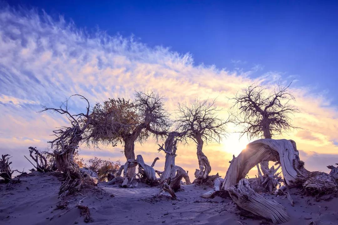 隨后我們游覽約一小時【怪樹林】,這里幾十年前是一片原始森林,由于水源不足等自然因素,大面積的胡楊樹木枯死。如今,枯木東倒西歪,神態(tài)各異,因此當?shù)厝朔Q之為怪樹林。我們將在怪樹林欣賞大漠落日,看滾滾落日從地平線上姍姍落下,形態(tài)各異的枯枝在大漠上畫出蜿蜒的影子。