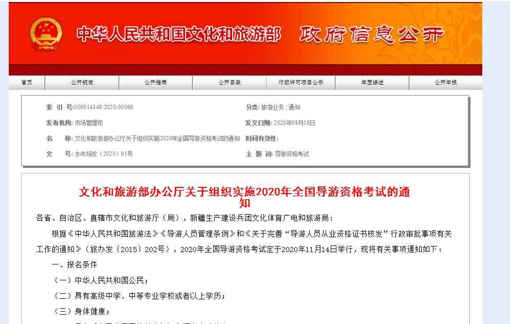 文化和旅游部辦公廳關于組織實施2020年全國導游資格考試的通知