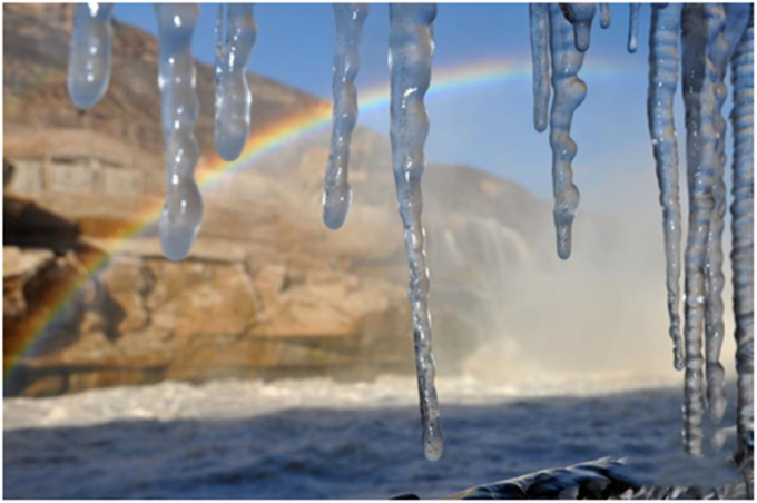 寒冬,冰封河面,瀑布失去了往日的狂奔怒號(hào)的野馬性格,變成了一座冰清玉潔的水晶宮,岸崖上,掛滿了長(zhǎng)短不齊,粗細(xì)各異的冰凌,晶瑩剔透,玲瓏奇巧。在陽(yáng)光的照射下,反著銀光。