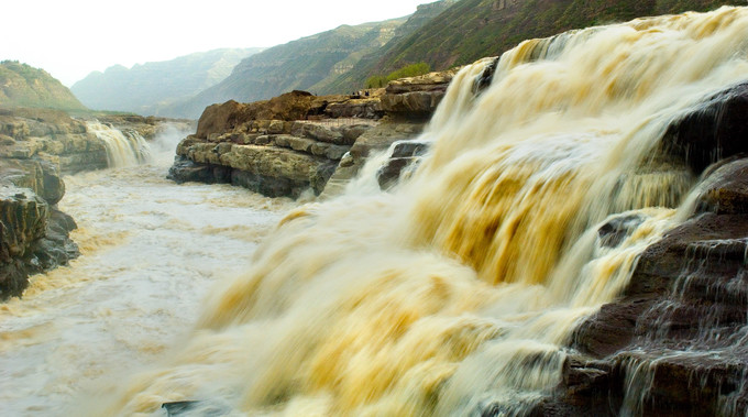 滔滔黃河,自青海源頭東流經(jīng)甘肅、寧夏,在內(nèi)蒙古河口鎮(zhèn)受呂梁山脈阻擋,轉(zhuǎn)南進(jìn)入秦晉峽谷。黃河流域到此似乎厭倦了一路的平緩,突然斂水成束,一頭扎進(jìn)這40米深的形似壺口的石槽中,剎那時(shí)這洶涌的急流,怒吼的洪波撞開(kāi)了一幕千古奇觀。這水,勢(shì)如排山倒海,驚天動(dòng)地;疾如萬(wàn)馬奔騰。頃刻間,猶如天河從天而來(lái)。