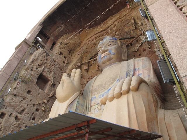 甘谷大佛石窟造象可遠(yuǎn)溯至北魏,具體年代已經(jīng)無從稽考。現(xiàn)存釋迦牟尼大佛像始鑿于北魏,一直到盛唐才趨完美。大佛石胎泥塑,身高23.3米,腰闊10.4米,結(jié)跏跌坐于蓮座之上,高大魁梧,溫順善良,坐于30.2米高、窟頂呈圓拱形的石窟內(nèi),頤面豐滿,肉髻高突,兩耳下垂,頸短并飾三道弦紋,短須作蝌蚪狀,施拔濟(jì)眾生印,足踩豐蓮??邇?nèi)還殘存懸塑達(dá)摩、頻伽、飛天、卷云、蓮葉等,栩栩如生。