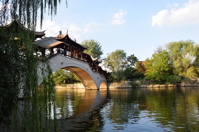 安瀾門(mén),為一座城門(mén)式水閘,遠(yuǎn)看與古運(yùn)河似乎融為一體,如城門(mén)懸于河面。步云橋,為通往古運(yùn)河中安瀾島上的一座仿古廊橋,如飛虹橫跨于古運(yùn)河面。