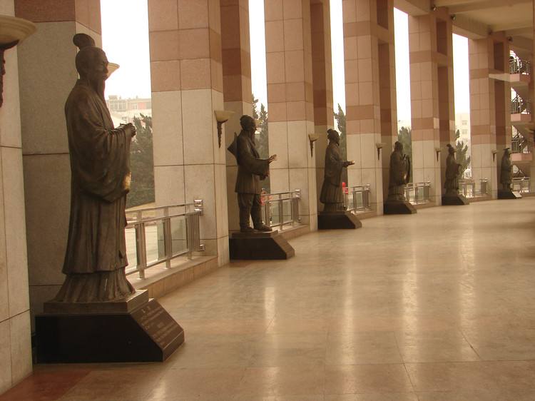 文化長廊位于泉城廣場東側,是泉城廣場東部重要標志性建筑物,也是登高欣賞廣場全貌的最佳場所。文化長廊呈圓弧狀,南北長150米,高16米,分三層。墻身嵌以中國傳統(tǒng)柱式造型,體現(xiàn)了傳統(tǒng)文化內涵。長廊內設大舜、管仲、孔丘、孫武、墨翟、孟軻、諸葛亮、王羲之、賈思勰、李清照、戚繼光、蒲松齡12尊歷史名人雕塑,鑲嵌在長廊南北兩端及西立面柱基上的14幅浮雕有東方曙光、舜耕歷山、伯禽治魯、太公封齊、管仲霸齊、晏嬰諫君、孔子講學、子貢貨殖、孫武兵法、稷下爭鳴、孟子游說、魯班學藝、扁鵲行醫(yī)、鄒衍辯論。這組浮雕命名為《圣賢史跡圖》。