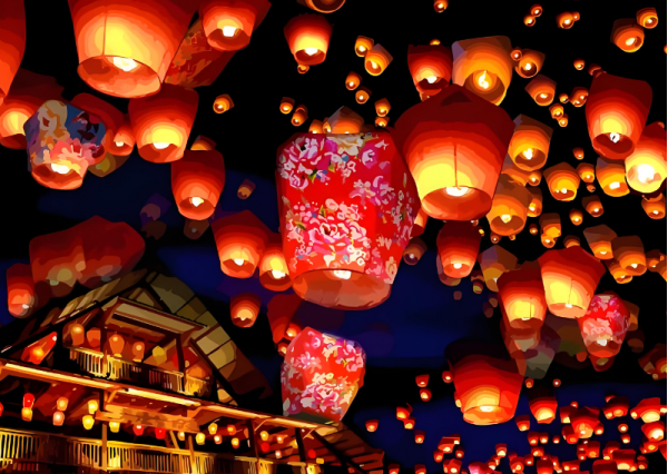 “放天燈”,來由是過去人們?cè)诙惚鼙I匪侵襲而四散逃逸之后,以燃放天燈為互報(bào)平安的信號(hào)。由于避難回家的日子正是元宵節(jié),從此以后,每年這一天,人們便以放天燈的儀式來慶祝,所以又稱天燈為“祈福燈”或“平安燈”。其后逐漸演變?yōu)橄蛏咸炱砀TS愿的民俗活動(dòng)。天燈上寫滿了心里的各種祈愿,希望天燈能上達(dá)天庭,帶給人無限的希望和光明。