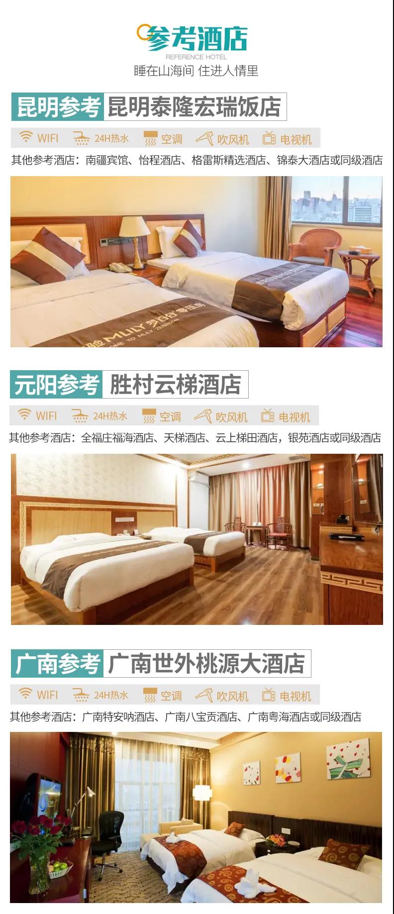 住宿 :行程所列7晚當?shù)鼐频陿碎g,并贈送集合日昆明四星酒店一晚。元陽景區(qū)酒店標間2晚、廣南準四酒店1晚、彌勒準四星酒店標間1晚、羅平縣三星酒店1晚、普者黑景區(qū)精品客?;蚓频?晚(景區(qū)內(nèi)住宿均為攝影農(nóng)家客棧標準間,不帶星級;因沿途條件有限,如酒店設(shè)施達不到您的期望,請您諒解)