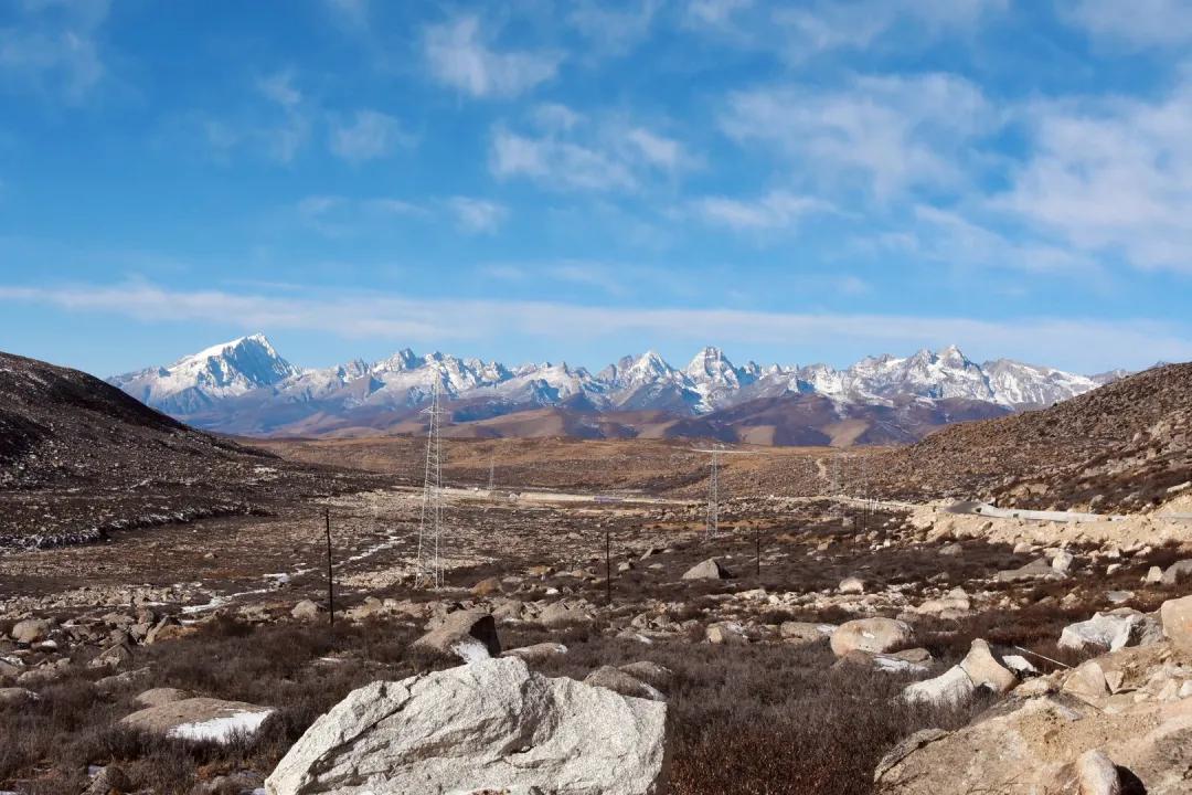 在從鐵匠山剛進入格聶山區(qū)時,格聶群峰橫陳天際,這是遠眺格聶群峰的最佳位置。在這里可以看到三座巨大的雪山從地平線上騰空而起,格聶、肖扎、喀麥隆、庫日崗中等數(shù)座神山從左向右一字排開,像一堵雪山屏障一樣,蔚為壯觀。