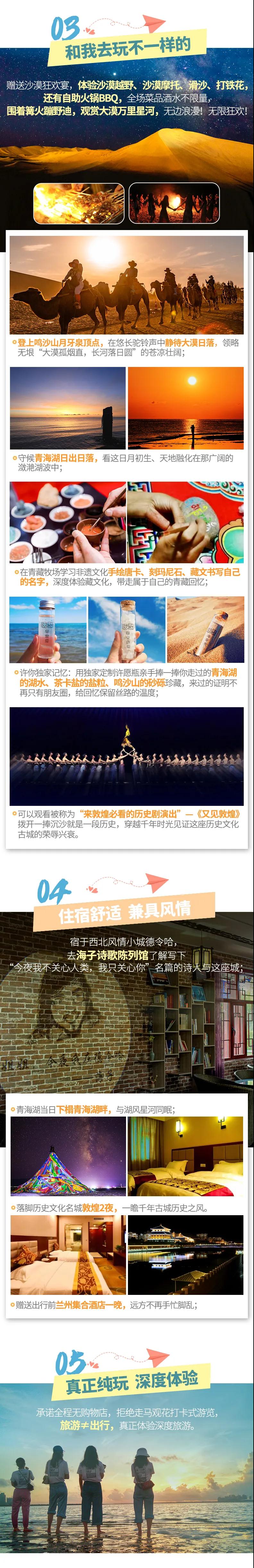 最后我們抵達敦煌,有人說過,這里的風(fēng)都有歷史的氣息。晚上我們就在這座古老的城市里來一場【沙漠狂歡】,在大漠無垠的星空之下體驗刺激的沙漠越野、沙漠摩托,玩玩有趣的滑沙、打鐵花,還有自助火鍋BBQ,全場菜品酒水不限量,大口吃肉大口喝酒,圍著沙漠篝火蹦個野迪!無限狂歡,無邊浪漫!