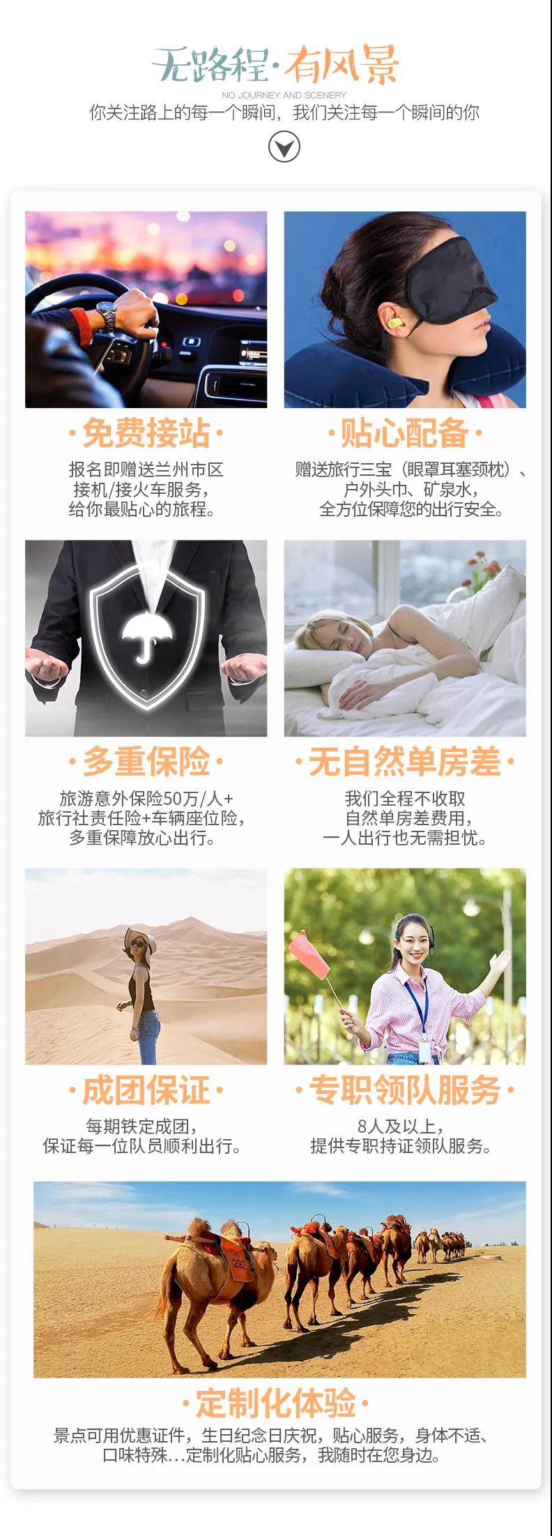 3. 如遇莫高窟門票售罄,未能預(yù)約成功,無法安排游覽,我們將調(diào)整行程前往游覽莫高窟姊妹窟“西千佛洞”,并退還差價170元/人,車費由我方承擔(dān),望您諒解。