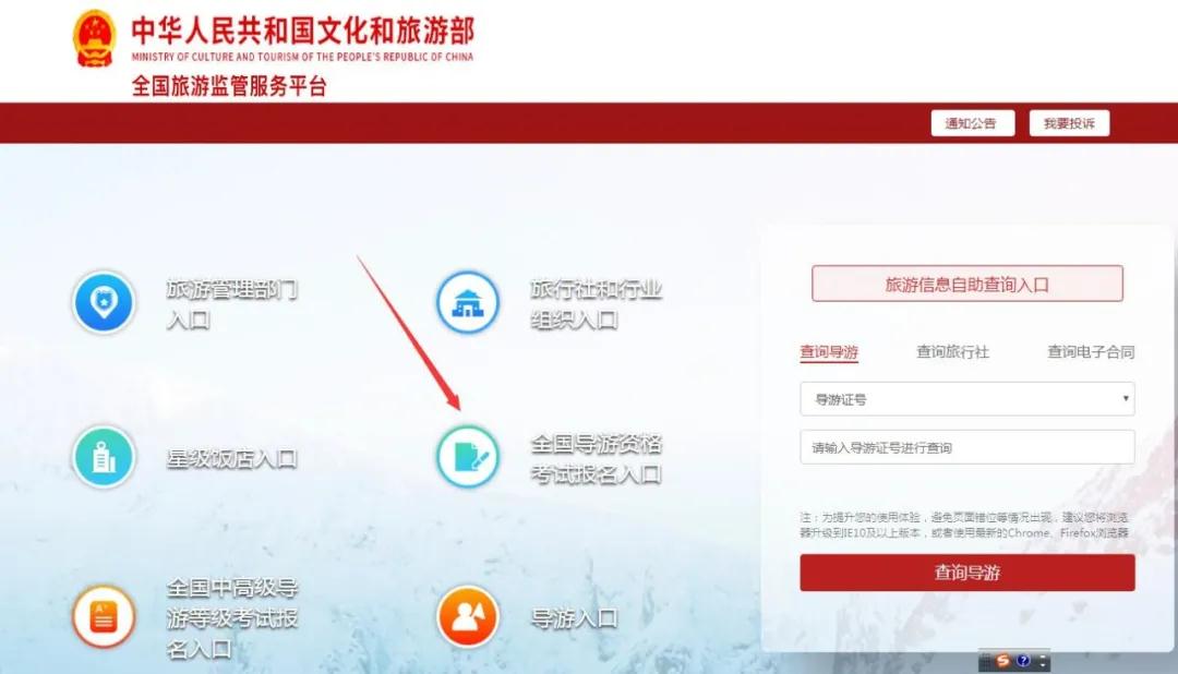 (進入“全國旅游監(jiān)督服務(wù)平臺”,選擇“全國導(dǎo)游資格考試報考入口”入口登錄)