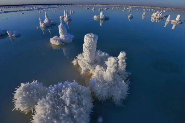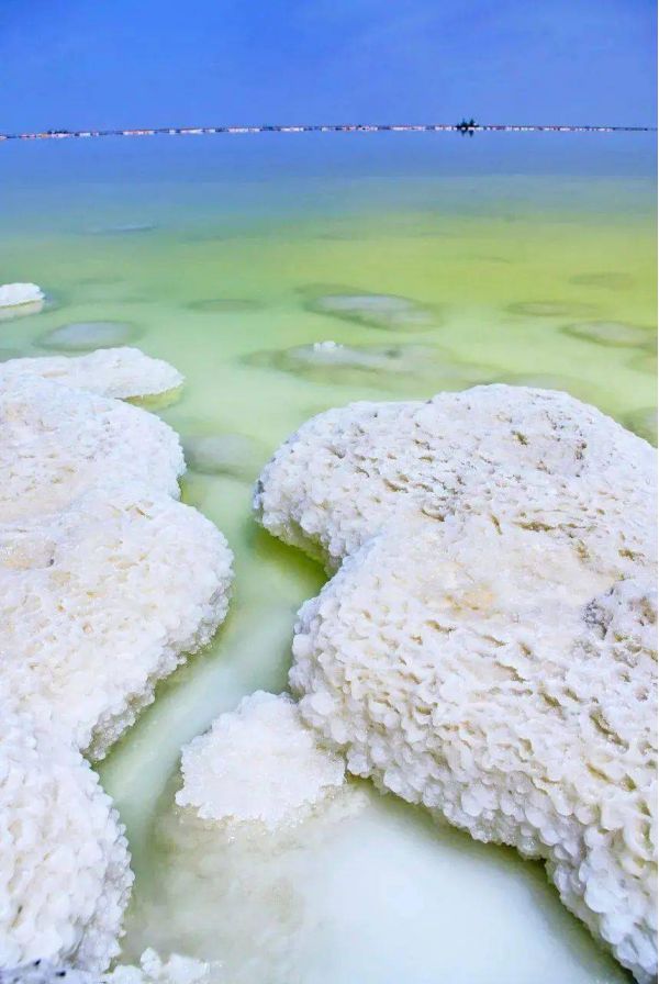 因?yàn)闅夂蜓谉岣稍?,湖水的蒸發(fā)量遠(yuǎn)遠(yuǎn)高于降水量,湖內(nèi)便形成了高濃度的鹵水,然后逐漸結(jié)晶成了鹽粒。而鹽花是鹽湖中的鹽結(jié)晶形成的特殊形狀的結(jié)晶體,由于結(jié)晶時(shí)的溫度,氣候,時(shí)間長(zhǎng)短,濃度不同等原因,形成了各式各樣,萬千變化的美麗鹽花。生命的禁區(qū),萬物俱寂,但是唯有“鹽花”開的最旺,它就是大自然賜給人類的絕妙作品,日夜看守這片凈土。這些鹽花無需人工的雕琢,形態(tài)各異,有的宛如貝殼,有的宛如樓臺(tái),一叢叢,一片片,一簇簇地立于鹽湖中,把鹽湖裝飾得如仙境一般。