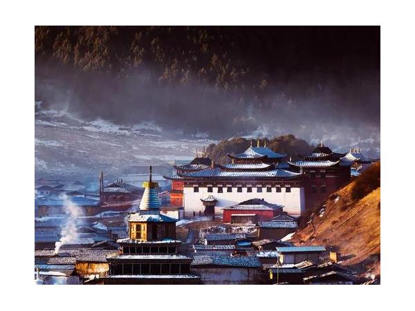 朗木寺最美的是清晨,小鎮(zhèn)被薄霧和炊煙籠罩,遠處朝陽的光彩映在郎木寺的紅色礫巖上,佛塔、清真寺和民房的屋頂都呈現(xiàn)出溫暖的光澤,整個小鎮(zhèn)就洋溢著一種淡淡的卻又揮之不去的恬靜與親和。