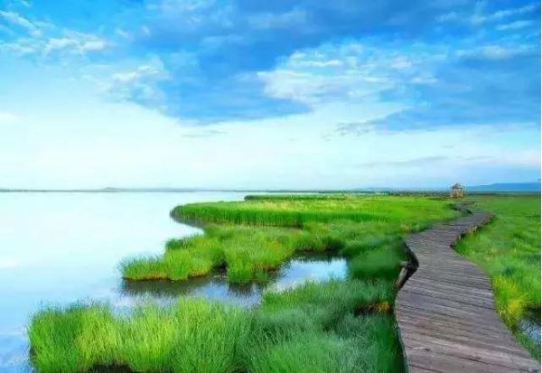 花湖像是鑲嵌在草原上的藍寶石,浮光躍金,一碧萬頃,湖岸邊蘆葦草豐茂。