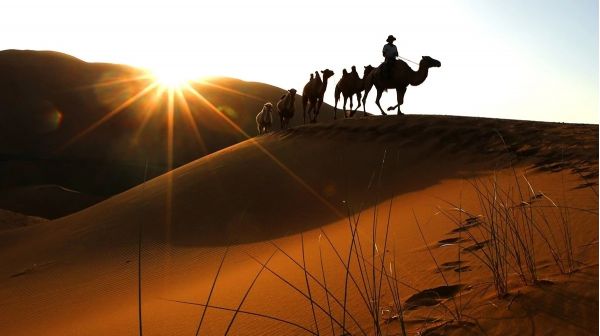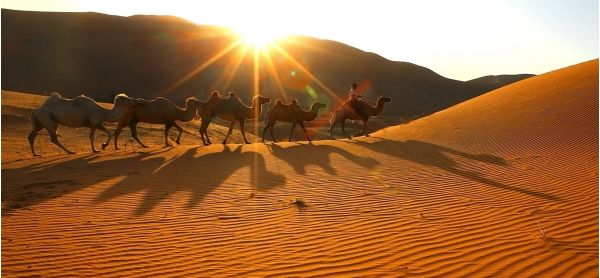 2、探尋中國最美的「巴丹吉林大沙漠」,拍攝駝隊(duì)在落日的沙漠中旖旎而行,日出日落時(shí)美麗的沙漠光影線條;